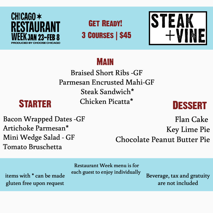 Opened in July 2016, Steak & Vine is a relaxed neighborhood steakhouse serving quality food, wine, and cocktails for dinner in beautiful downtown La Grange, Illinois.